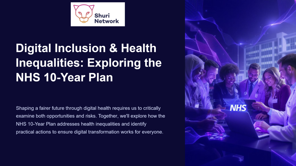 Discuss the risks and opportunities of the NHS 10-year plan on health inequalities and design a practical plan for action. Led by Eddie Olla, Shuri steering group member, and Chief Digital and Information Officer at NHS Coventry and Warwickshire Integrated Care Board. Register your place at the Digital Inclusion workshop